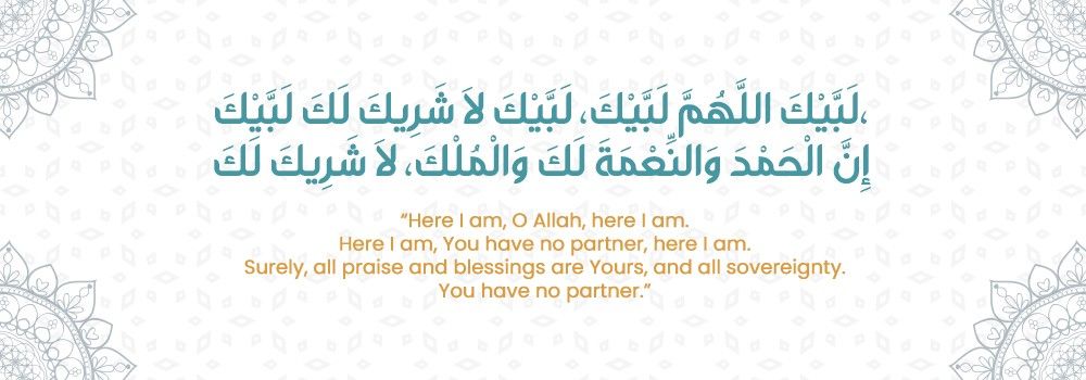 "Here I am, O Allah, here I am. Here I am, You have no partner, here I am. Surely, all praise and blessings are Yours, and all sovereignty. You have no partner."